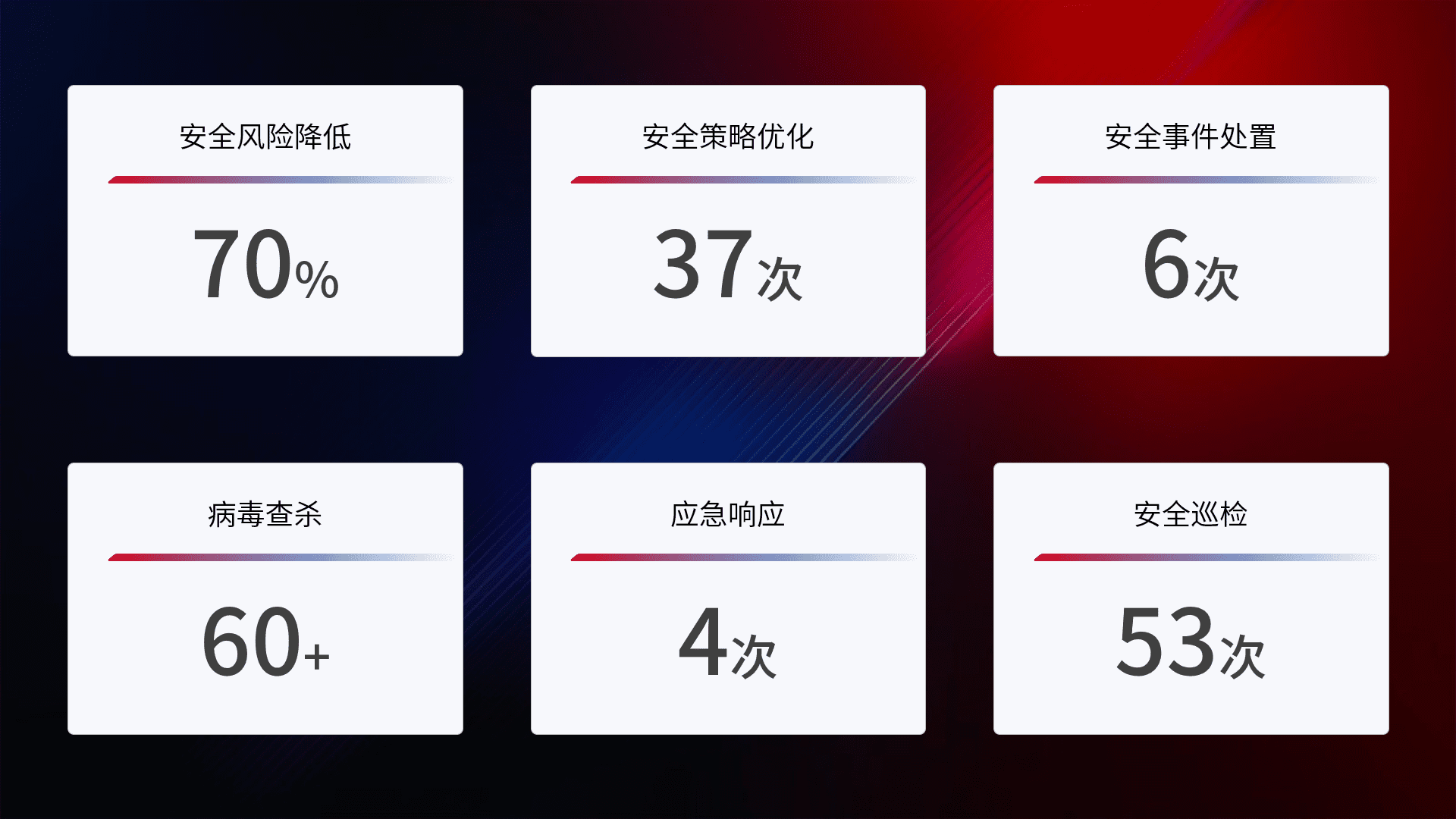 提供全面的安全事件报告体系,,,包括处置报告、、、周报、、、季度和年度总结,,,,结合持续监控,,帮助客户深入了解网络安全状况。。。。