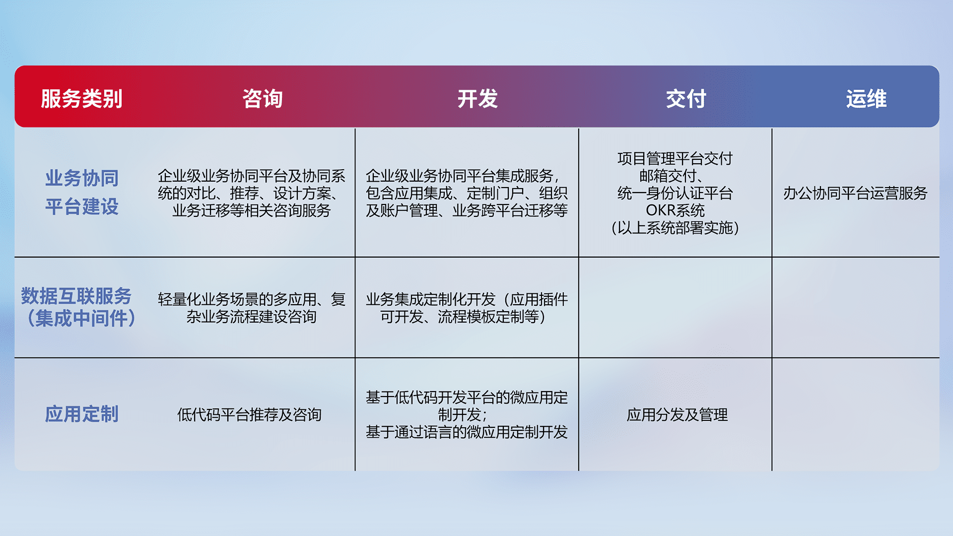 针对钉钉、、、、企微、、、、IDaas等平台级产品提供产品的规划、、、方案、、、、交付、、、定制化开发等服务,,实现如统一协同办公、、、智能客户服务、、混合会议管理、、智能数据查询、、等业务场景,,实现数字化转型。。。。
